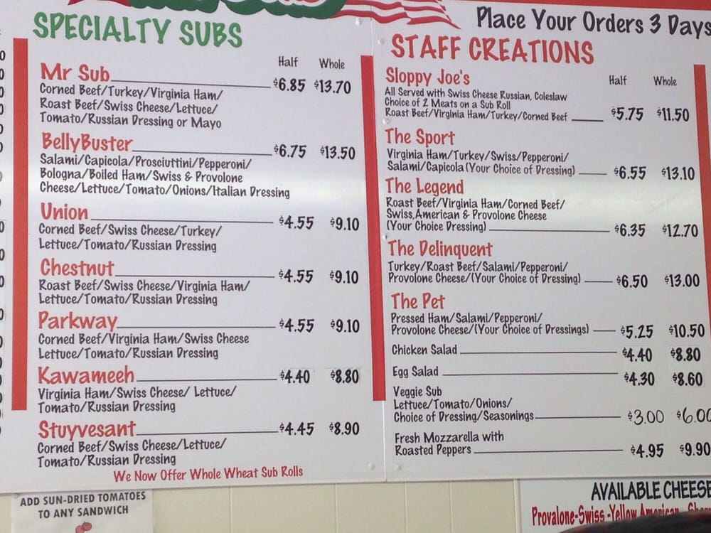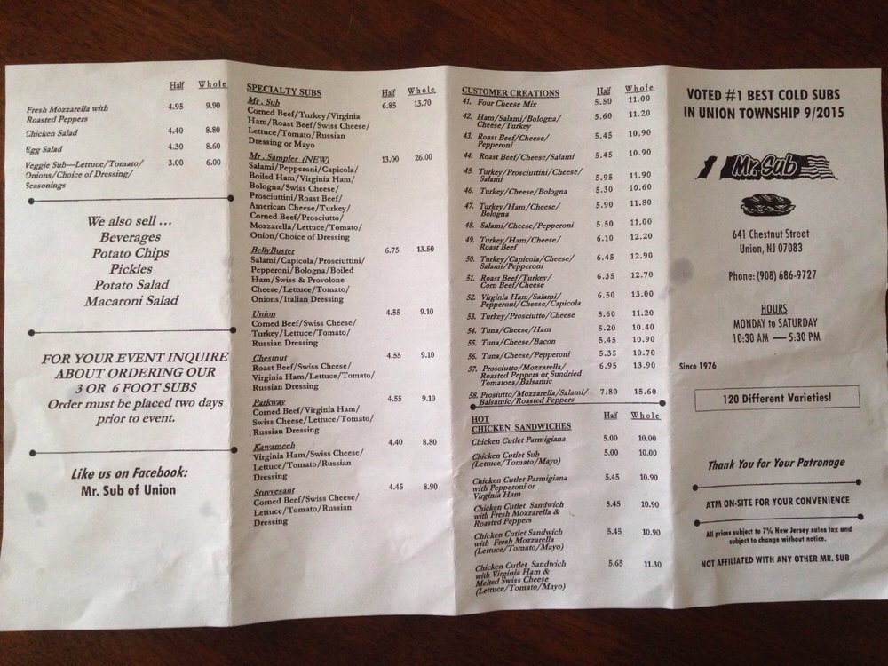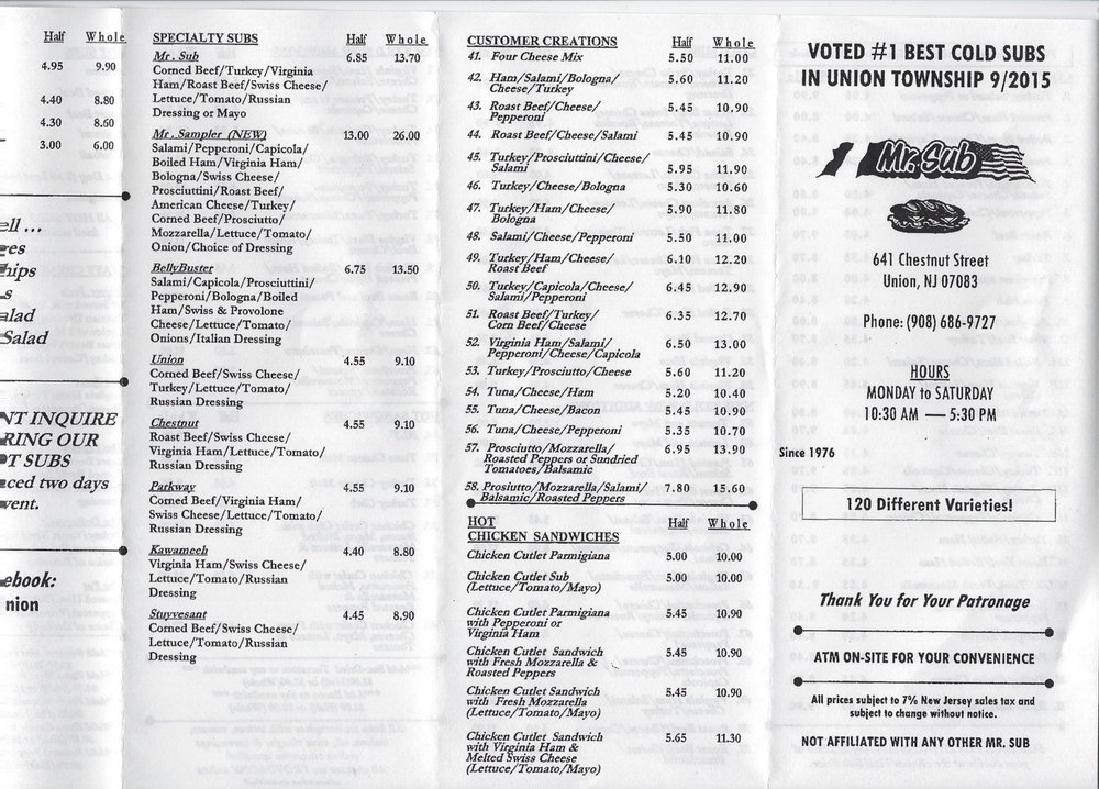 Introducing the menu at Mr. Sub of Union, a renowned sandwich shop in New Jersey, where quality and variety meet satisfaction. Specializing in subs like the signature Mr. Sub Made with a combination of premium meats and Swiss cheese, or the indulgent Mr. Sampler boasting an array of flavors, there's something for every palate. Don't miss out on the Hot Chicken Sandwiches, like the Chicken Cutlet Parmigiana, packed with savory goodness. Customer favorites include the #41 Four Cheese Mix and #42 Ham/Salami/Bologna/Cheese/Turkey creations. With over 100 sandwich options, from classics to customer creations, Mr. Sub of Union caters to all tastes and preferences. Enjoy the friendly service, generous portions, and the always-fresh ingredients that keep customers coming back for more. Experience the inviting atmosphere, exceptional cleanliness, and extraordinary value at Mr. Sub of Union – a must-visit destination for sandwich lovers.